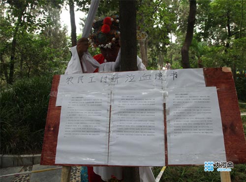 記者在現(xiàn)場(chǎng)看到,“財(cái)神爺”旁邊還放著一塊寫(xiě)著“農(nóng)民工討薪泣血遺書(shū)”的木板。上面寫(xiě)著“誰(shuí)想死?螻蟻尚且貪生。但我也是被逼無(wú)奈,錢我討不到,房租要交,妻母要生活,工人要工資,可老板拿我當(dāng)球踢,我咨詢過(guò)很多部門,可都幫不了我,我活得太累了,可死,我也要讓黑心的老板們明白些什么?為了生活,我已經(jīng)向朋友借了九千多元的債,我的大孫女今年才三歲半,她幾乎天天都在告訴我;‘爺爺,我要上學(xué)’,每當(dāng)聽(tīng)見(jiàn)這句話,我的心都快碎了,二孫女才二十個(gè)月,雖然還不知道向爺爺要求什么,但孩子一天天大了,也要上學(xué)了。