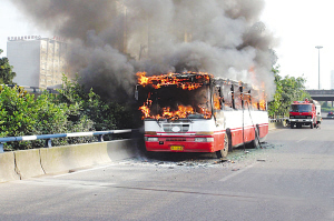 早8點35分,北京市東南三環(huán)華威橋南側一輛638路公交車發(fā)生自燃,司機在發(fā)現(xiàn)危險情況后立即將公交車停靠輔路安全地帶,疏散車內乘客,并報警,8時50分,公交車大火被消防員迅速撲滅。