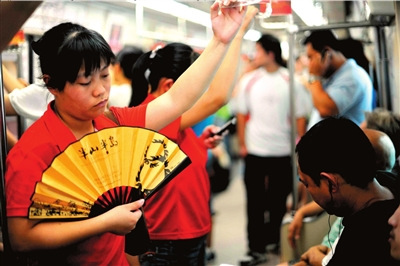 昨天上午8點多,記者擠在1號線“風(fēng)扇車”里,用手抹了一把臉上的汗水。從四惠東站到國貿(mào)站,這樣的動作重復(fù)了十多次。車廂內(nèi)的乘客,有的臉上掛著焦灼的表情,不時用手扇風(fēng),有的小心翼翼地避免和他人身體接觸,以免黏著汗水,有的用手輕捂著鼻子,試圖避開周圍的汗臭味。