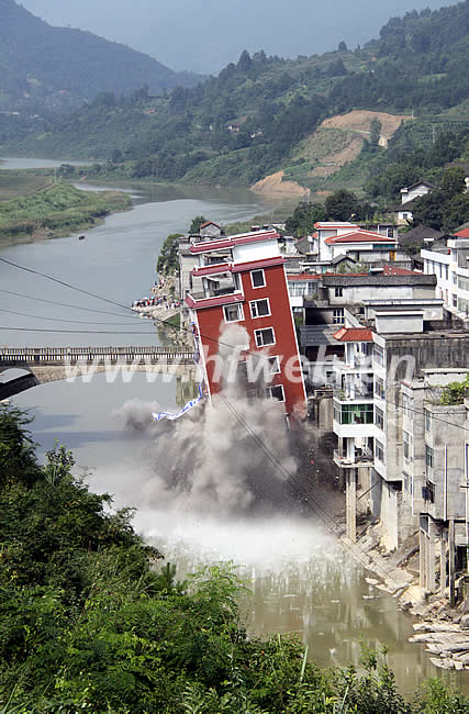 在限期內(nèi),房主仍未自行拆除。7月24日,縣防汛抗旱指揮部委托湖北宜昌一家爆破公司承擔該違法建筑的爆破拆除任務(wù)。