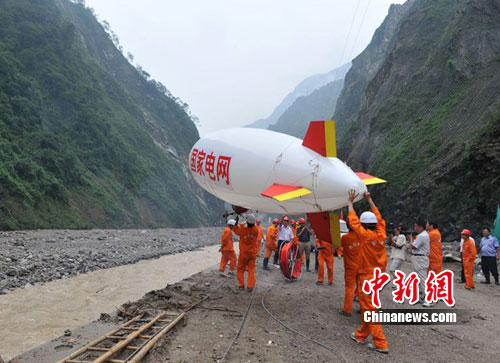 由于架設(shè)該段架空線路需橫跨綿遠(yuǎn)河,線路與河水最大高差達(dá)68米,且河水湍急,按照傳統(tǒng)施工作業(yè)方式根本無(wú)法進(jìn)行。為盡快搶通架空線路恢復(fù)災(zāi)民永久性供電,國(guó)家電網(wǎng)四川省公司調(diào)集綿陽(yáng)、樂(lè)山、德陽(yáng)等地的電力搶修人員共計(jì)160余人現(xiàn)場(chǎng)聯(lián)合奮戰(zhàn)。