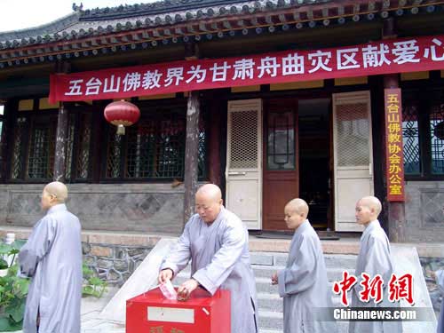 23日上午8時左右,五臺山佛教協(xié)會門外,不約而同趕來的五臺山各寺廟的師傅們排成了幾條長龍,飽含著對舟曲災(zāi)區(qū)人民的關(guān)愛之意,捧出一片愛心,神圣地放入了捐款箱中,從而掀起了五臺山佛教界向舟曲災(zāi)區(qū)人民送溫暖、送愛心的高潮。