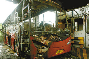 交警和消防人員接警后趕到現(xiàn)場,此前收費(fèi)站工作人員已積極投入到滅火搶險(xiǎn)中,乘客在司機(jī)的指引下均已從大巴砸碎的玻璃窗中順利逃出,在安全地方等待,無人員傷亡。在消防人員用高壓水龍頭噴射半小時(shí)后,大火才被撲滅了。