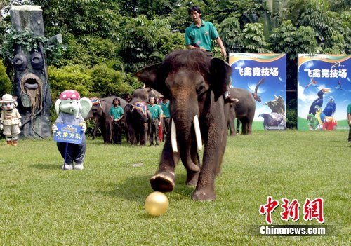 陣容最強(qiáng)大的壓軸方隊(duì)是10只大象,它們參加了運(yùn)動會的球類項(xiàng)目,比賽現(xiàn)場擺了4個大氣球,大象向著觀眾席大腳一踢,觀眾都不自覺地當(dāng)起守門員,穩(wěn)穩(wěn)地把球接住。