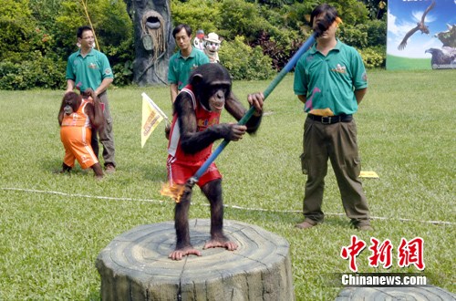 緊接著出場的是猩猩方隊(duì),5只猩猩穿上運(yùn)動裝,精神抖擻。為了表現(xiàn)訓(xùn)練成果,他們迫不及待地點(diǎn)起熊熊火棒,觀眾看得驚險萬分,可這些猩猩運(yùn)動員卻舞得從容自在。隨后,黑猩猩跟黃猩猩還進(jìn)行了一場拔河比賽。
