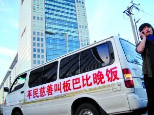 發(fā)起人之一王一飛的朋友透露,巴比晚宴可能在盤古七星酒店舉行,便一路駕車來到盤古大觀,車上的“平民慈善叫板巴比晚飯”字幅,引起路人圍觀。