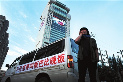 “平民慈善叫板巴比晚飯!弊蛱煜挛5點,朝陽區(qū)北四環(huán)中路盤古大觀酒店樓下,一輛白色面包車身上的挑釁口號引得周圍市民駐足觀看。