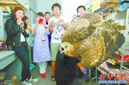 美術學院的女生小劉告訴記者,28日傍晚6時許,她第一個回到宿舍,剛進門陽臺外突然飛進來一只大鳥,沖著她的臉撲來,嚇得她抱頭尖叫,趕緊沖出了宿舍,“我仔細一看才發(fā)現(xiàn)是一只老鷹,我很害怕,就叫男生來幫忙了!