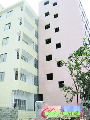 據(jù)網(wǎng)友爆料,這兩棟樓出自海南省海口市龍華區(qū)高坡村。從兩棟樓的側(cè)面看,兩棟樓之間的目測(cè)間距不足10厘米,幾乎就是貼在一起,這不免讓人驚嘆其建筑水平之高。