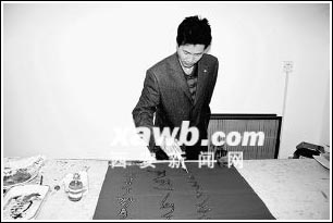 據(jù)王璽介紹,他自幼酷愛書法,2004年在西安學習期間,參加了由省政協(xié)組織的書畫活動,他見書畫名家雷長安表演的書法針筆運筆剛柔相濟,結字嚴謹多變,布局渾然大氣,風格酣暢灑脫,便產生了針書創(chuàng)作的念頭。今年,他積極摸索,利用醫(yī)療器械注射器作為工具作筆寫字,將調和的裝飾材料溶液吸到針管里,蘸到“筆尖”上,使金墨銀墨在深色宣紙上流動成為書法作品,如同毛筆在生宣紙上寫字一樣有節(jié)奏、有韻律,極具觀賞性。 (記者張松)