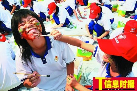 昨天,是廣州市第十三屆成人宣誓日,全市有15萬(wàn)名18歲青年參加了宣誓。在白云國(guó)際會(huì)議中心西廣場(chǎng)的主會(huì)場(chǎng),1800名18歲青年以涂鴉的形式來(lái)行“成年禮”,18歲的夢(mèng)想和祝福五顏六色地鋪滿了整個(gè)廣場(chǎng),其中創(chuàng)作主題多以北京奧運(yùn)和激揚(yáng)青春為主。白云中學(xué)的岑翠齊和陳思敏還把涂鴉涂在了臉上,“從此天地由我們開(kāi)創(chuàng)!”兩位女同學(xué)充滿憧憬。另外,廣州話劇團(tuán)還現(xiàn)場(chǎng)為同學(xué)們表演《18歲的青春》情景劇,送給所有18歲的青年。