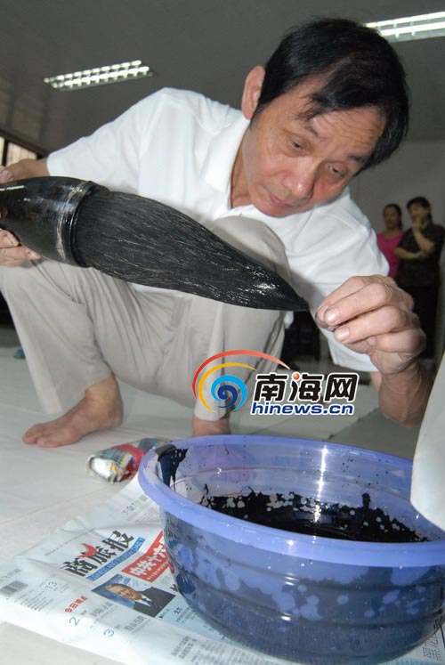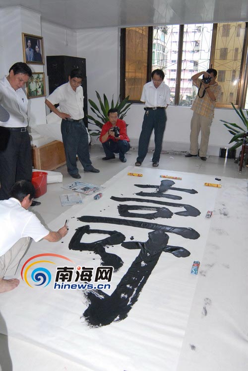 今天下午4時許,在海口市文藝聯(lián)合會會長的辦公室里,余廣老先生先先是拿出他在家里練筆的大壽字向在場的記者們展示。展示完后,余老先生拿出自已帶來的筆和紙。在地上鋪上一張長達3.7米,寬為1.47米白紙,將白紙整平后,余老先生開始調(diào)墨,在文聯(lián)工作人員的幫助下,余先生揮起自己帶來的大毛筆,仔細整理毛筆后,余老先生在白紙開始揮舞,不用一會兒功夫,一個大形楷書壽字就寫成,在場的人給予了熱烈掌聲。(記者汪德芬)