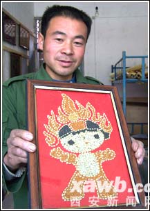 據(jù)陳群虎介紹,一次偶然的機(jī)會(huì),他從雜志上看到一篇報(bào)道,北京有人用五谷雜糧經(jīng)過處理以后做出了衣服,他想既然能用糧食做衣服,也就能用糧食寫字作畫。隨后,陳群虎便放下手頭的工作,專門來創(chuàng)作他的五谷字畫。經(jīng)過半年多的研究學(xué)習(xí)和嘗試,陳群虎終于成功創(chuàng)作出了具有濃濃鄉(xiāng)土氣息的“五谷字”。他的作品全都是用草籽、糜子、豆子谷物制作而成,字畫中的顏色也都是用這些顏色各異的谷物搭配成的。他作畫時(shí)用的工具都是在果樹嫁接時(shí)用的嫁接刀、鑷子、鋸等。陳群虎告訴記者,現(xiàn)在已經(jīng)有不少作品被鄉(xiāng)親們收藏了,這給了他極大的鼓舞和激勵(lì),他將一直創(chuàng)作下去。(記者 張海鵬文/圖)