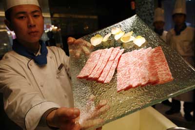 據(jù)該店廚房經(jīng)理任先生介紹,他們所銷售的肉品分為國產(chǎn)的和進(jìn)口的兩種。其中,“日式降霜肥!焙汀叭帐街磷鸱逝!边@兩道售價(jià)較高的特色菜所采用的原料為日本進(jìn)口牛肉,每份售價(jià)分別為688元和578元。