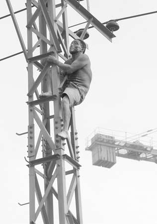 記者立即趕往現(xiàn)場,只見一男子光著上半身,在路邊的高壓電線桿上。此時(shí),110民警、119火警和120救護(hù)車都已到現(xiàn)場,一名中年婦女正拿著擴(kuò)音喇叭操著四川口音大喊:“你先下來,上面有電,小心電到你!”但該男子卻毫不理會,在電線桿上一會爬上,一會爬下,還不時(shí)地試圖觸摸頭頂上的高壓電線。圍觀的群眾都大喊他下來,可他就是不聽。記者看到,該男子臉上和胸部流滿了鮮血,血跡已經(jīng)發(fā)黑。