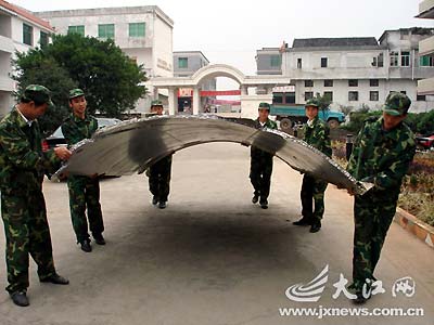 因天氣原因,直至30日下午,飄落于全南縣深山的運載“嫦娥一號”衛(wèi)星的長征三號甲火箭整流罩殘骸,在該縣人武部人員的護(hù)送下運往有關(guān)部門。記者獲悉后,獨家對此進(jìn)行了采訪。