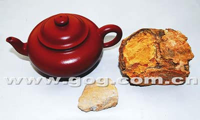 為了證實(shí)此壺真?zhèn)危蹴槹l(fā)還專門贈送駱先生制壺原礦兩塊(見圖),同時(shí)在收藏證中提到并以此為證。在上?萍汲霭嫔绯霭娴摹蹲仙皦罔b賞寶典》一書中記者看到,圖中大塊的原礦叫石黃心,小塊的叫大紅泥礦,兩者按照一定比例混合則成大紅袍泥,此泥產(chǎn)于宜興市黃龍山,泥質(zhì)細(xì)膩密度大,屬十分稀有泥類,是制宜興紫砂壺頂級泥料。