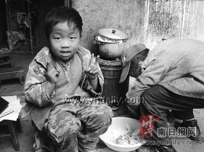 中午1時(shí),是祖孫兩人的午飯時(shí)間,一碗清水煮白菜、一碟咸菜就是兩人的下飯菜!拔易钕矚g吃的東西就是腐乳拌飯,還有蘿卜、白菜……”問起珍珍最喜歡吃的東西時(shí),她響亮地回答。給她照相時(shí),她就沖著鏡頭做鬼臉,笑嘻嘻地比著V字形的手勢,天真無邪的樣子,讓人看了既心疼又心酸。