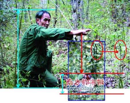 11月4日,本報(bào)(注:南方都市報(bào))記者以普通網(wǎng)友的身份隨手發(fā)布了一張周正龍重回現(xiàn)場的圖片,沒想到引起了網(wǎng)友的極大興趣,甚至一些網(wǎng)友拿這張圖片與之前的系列虎照對比,從其中標(biāo)志性植物枝葉的大小高低和位置關(guān)系得出了老虎只有貓大的猜測,認(rèn)定這就是“周老虎”作假的終極鐵證。但也有網(wǎng)友表示反對,認(rèn)為無法確定老虎與標(biāo)志性枝葉的關(guān)系。