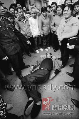 記者在現(xiàn)場(chǎng)看到,傷者躺在馬路中間,妻子抱著丈夫滾在地上痛哭不已,上百名圍觀市民看到這種狀況,紛紛譴責(zé)執(zhí)法人員。情緒激動(dòng)者還將執(zhí)法人員圍住,現(xiàn)場(chǎng)一片混亂,該路段交通短暫堵塞。十多分鐘后,傷者被執(zhí)法人員抬到路邊,交通得以緩解。