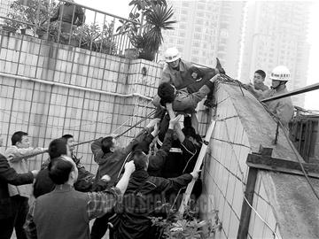 記者趕到現(xiàn)場時,正當(dāng)消防戰(zhàn)士準(zhǔn)備著手解救該男子。記者看到,現(xiàn)場有數(shù)百居民圍觀。跳樓男子站在一7層高樓樓頂外側(cè)的巨幅廣告牌鋼架上,樓下警方拉起了警戒線。幾名身系保險繩的消防戰(zhàn)士從該樓樓頂慢慢攀爬上了巨幅廣告牌鋼架。驚心動魄的一刻終于發(fā)生了,消防戰(zhàn)士將該男子拉住,并用隨身攜帶的安全繩縛住男子身體,將男子從鋼架轉(zhuǎn)移至樓頂,整個解救過程,歷時40余分鐘。