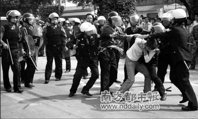 野雞車被查后逃竄,運(yùn)政稽查車被砸并遭圍攻,盾牌晃動(dòng)、鋼盔閃亮……昨天上午9時(shí)45分,廣州市交通運(yùn)輸管理局運(yùn)政稽查一大隊(duì)十余名工作人員在蘿崗區(qū)宏明路口查處“野雞車”時(shí),遭到暴力抗法并被20多名湖南籍男女圍困近3小時(shí)。警方在三次勸說(shuō)無(wú)效后于中午12時(shí)出動(dòng)100多名警力將這些男女強(qiáng)行帶離。