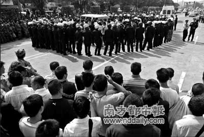 現(xiàn)場(chǎng)一片緊張的氣氛。20多名男女聚集在蘿崗區(qū)宏明路16號(hào)門口,面紅耳赤地吼叫著。他們旁邊是一輛保險(xiǎn)杠和雨刮都不知去向的面包車,窗前支著一塊“運(yùn)政稽查”紅色牌子;他們身旁是由特警、民警、輔警和治安隊(duì)員百余人組成的一道封鎖線和約250平方米的封鎖區(qū),封鎖線旁則是數(shù)百圍觀的群眾。
