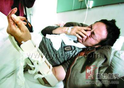 記者看到李君鐘時(shí),他正準(zhǔn)備做手術(shù),主治醫(yī)生告訴記者,李君鐘多處軟組織挫傷,頭部受傷縫了7針,左臂骨折,傷情跡象表明,肯定是嚴(yán)重的外力所致。“我怎么這么倒霉!因?yàn)檎也坏阶约旱能?chē),就挨了一頓打!”說(shuō)起當(dāng)晚的情形,李君鐘忍不住淚流滿(mǎn)面,他說(shuō),當(dāng)晚,因?yàn)楹团笥讯嗪攘藥妆,記得自己的?chē)停在錦苑花園小區(qū)門(mén)口,但可能是喝多了,到門(mén)口一看,卻怎么也找不著車(chē)了,難道車(chē)被偷了?他趕緊四處找車(chē),不知不覺(jué)就進(jìn)了小區(qū)。剛進(jìn)小區(qū),突然有幾名保安跑過(guò)來(lái),二話(huà)沒(méi)說(shuō)就開(kāi)始打他……
