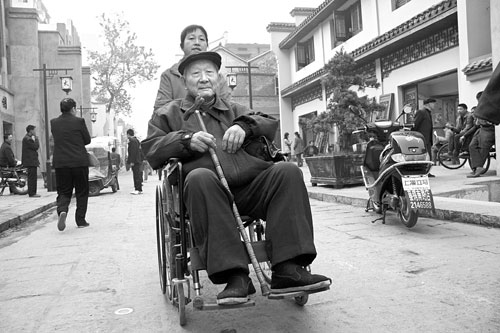 “盧爹,今天大盤怎么樣?”當老人結(jié)束一天的看盤,由他的保姆推著輪椅回到太平街時,一路上都有人不斷地笑著向他詢問,而他只是呵呵笑著點頭示意。(記者龔磊文/圖)