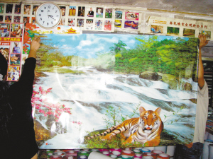 記者隨即趕到這家商店。店里的伙計(jì)從倉庫里面搬出50張已經(jīng)落了灰塵的一卷年畫。展開一看,全部是一模一樣的《老虎臥瀑圖》。上面均印有“鑫龍墻畫”的商標(biāo)和“TQ8301”的編碼。
