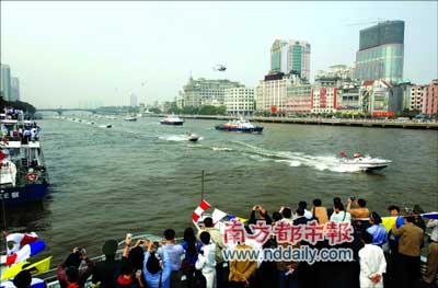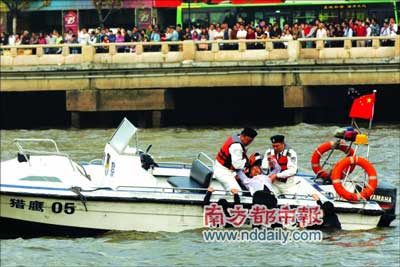 疑犯開著快艇一路狂逃,半路將人質(zhì)踹入水中;警方救人、擒賊、打撈物證,十幾分鐘內(nèi)全部完成。昨天,走過百余年歷史、默默守護(hù)珠江的廣州水警由幕后走向前臺(tái)!鞍倌晁賱(chuàng)輝煌”2007年廣州警察開放日活動(dòng)在濱江西路水警碼頭和人民橋至解放大橋之間的珠江河面舉行。廣州水警向萬名圍觀市民演示了水上反劫持抓捕行動(dòng)。這是第六屆廣州“警察開放日”活動(dòng)的重頭戲。此外,水上表演還包含消防船表演、飛行表演等多個(gè)項(xiàng)目。