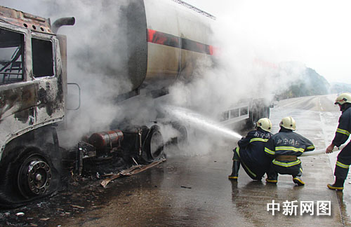 據(jù)消防官員稱,距現(xiàn)場(chǎng)1公里處,天空升起滾滾黑煙,現(xiàn)場(chǎng)油罐車火勢(shì)已經(jīng)在車頭和罐體整體燃燒起來(lái)。參戰(zhàn)官兵立即運(yùn)用消防車車載水炮,冷卻油罐車罐體。10分鐘后,消防官兵在高速公路上鋪設(shè)兩條水帶干線,利用2支水槍前后夾擊進(jìn)攻油罐車車頭和罐體火勢(shì), 20分鐘后,油車大火被成功撲滅。