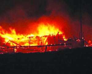 就在船主專心致志捕魚之際,突然他感到江面映出火苗的光亮。回頭一看,只見船艙里冒出一片火來(lái),“不得了,怎么失火了?”船主大吃一驚,連忙丟下漁網(wǎng),拎起一桶水就潑過(guò)去,但杯水車薪,根本不管用,火勢(shì)越來(lái)越大,他將帶繩的桶扔到江里,想從江里打水上來(lái)?yè)浠,但還沒(méi)等打上來(lái)第一桶水,剎那間,整個(gè)船艙就成了一片火海。由于火勢(shì)兇猛,他的頭發(fā)眉毛都被燒焦了?粗矍八袞|西都著火了,他意識(shí)到還是逃命要緊,被迫棄船,轉(zhuǎn)身向船頭跑去,對(duì)著江里的棧船就跳了過(guò)去。船主剛跳上棧船,就聽后面“轟”的一聲巨響,放在船艙里的那桶柴油也被燒著了。