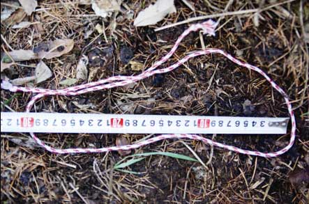 現(xiàn)場人員決定再從河邊著手,查找可疑痕跡。調查人員發(fā)現(xiàn),在腳印左邊的灌木叢上,一根距地面1.2米高的樹枝擋住去路,其上3根小枝似乎被不明物體通過時絆動,因擠壓而折斷。地上有明顯不規(guī)則的連續(xù)腳印,步距1米多。在腳印繞過一塊大石頭的地方,他們發(fā)現(xiàn)落葉腐殖土上的一大一小、同向、前后相鄰的兩個腳印(非鞋印),且能夠分辨出均為左腳。由于時間有限,調查人員決定放棄用帶來的石膏灌制腳印模型,待后續(xù)處理。