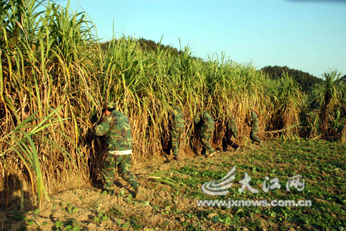 昨日下午3時許,由數(shù)十名德興市武警戰(zhàn)士、上饒市特警、德興公安民警以及民兵等人員組成的搜捕隊(duì)再一次來到付家墩,他們對付家墩村村后的百畝甘蔗進(jìn)行了全面搜查。
