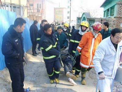 然后,消防隊員馬上對現(xiàn)場的土層和混凝土塊進行清理。當發(fā)現(xiàn)被埋較深的兩名工人后,經(jīng)檢查,一人已經(jīng)死亡,另一人仍有生還希望。