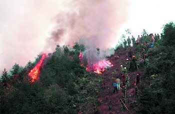 昨日上午9時許,大風讓火勢再次蔓延。此時,600多名增援的武警、消防戰(zhàn)士、民兵預備役戰(zhàn)士迅速投入到山火的撲救之中。寬25米、長1公里的隔離帶剛剛砍伐成功,迅猛的火勢立即就蔓延過來。到上午11時,4條隔離帶相繼失守。常規(guī)的山火撲救方法已經(jīng)無法奏效,只得重新布置兵力。20米的隔離帶被拓寬到了25米,三組人員同時展開戰(zhàn)斗。記者在現(xiàn)場看到,附近許多村民已將自家的電視機、桌子、衣被等物什全部搬至空曠地。