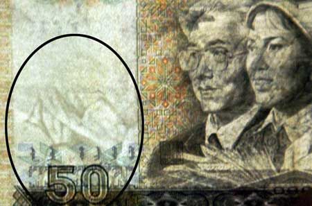 后經記者仔細辨認,發(fā)現(xiàn)這張編號為GS8790902的1990年版的50元人民幣和其他同版本同面值的一樣,正面都是工人、農民和知識分子頭像,背面是黃河的壺口瀑布,不同的是正面毛主席像水印頭像卻呈倒立狀,并且位置比正常錢幣偏上。這張錢幣的水印和正常錢幣的差異如此之大,難道是張假幣?可是朱燦祥卻告訴記者,他的這張鈔票無論在哪家銀行驗鈔,都會出現(xiàn)同一個結果:是張真幣。