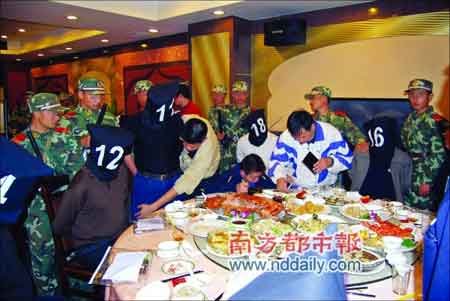 知情人介紹,抓捕行動(dòng)計(jì)劃事前極為保密,實(shí)施抓捕的一線警察與武警大多在當(dāng)日下午才獲悉具體的抓捕目標(biāo)。當(dāng)日下午,警方以日常設(shè)卡方式在陽江市交通要道部署警力,在犯罪嫌疑人放松警惕的情況下,在街面分布了數(shù)百警力。同時(shí),以設(shè)卡方式迫使犯罪嫌疑人無法大量攜帶武器出席宴會(huì)。當(dāng)晚7時(shí),近千名武警與警察將該火鍋城包圍。30分鐘后,指揮員一聲令下,數(shù)百名武警與警察沖進(jìn)火鍋城4樓某包間。根據(jù)事先獲得的情報(bào),林國欽黑幫團(tuán)伙的主要成員都集中在該包間中,分坐3桌。其他包間中的出席者主要為團(tuán)伙中的非骨干成員以及部分群眾。其形容武警持槍進(jìn)入包間時(shí),林國欽剛與眾人舉杯開席,見抓捕者不是當(dāng)?shù)鼐於俏渚粫r(shí)目露失望之色。其他成員也完全沒有抵抗,即被全部按倒在酒桌上,站在邊上的黑衣保鏢未及反應(yīng)也被制伏!罢麄(gè)過程不超過5分鐘”。一個(gè)多小時(shí)后,數(shù)十名黑幫骨干黑袋蒙頭被陸續(xù)押上警車。