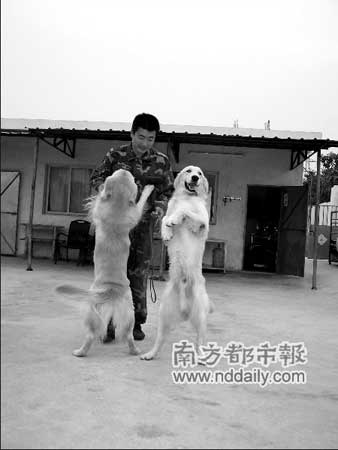 接著,在楊先生的指揮下,一條100多斤的臺(tái)灣高山狗“老虎”被牽出,在記者面前表演起握手、站立等技巧。拉布拉多獵犬“LUCK”則乖巧地表演起站立、跳圈、轉(zhuǎn)圈等絕技。兩條黃金獵犬因?yàn)樵谟?xùn)練師面前“爭(zhēng)風(fēng)吃醋”,競(jìng)相撲到訓(xùn)練師身邊,做出站立、跳躍等動(dòng)作吸引訓(xùn)練師的注意,逗得眾人哈哈大笑。
