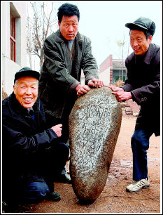 張步高發(fā)現(xiàn)一塊石頭上面刻著怪字的消息不脛而走,周圍的鄉(xiāng)黨紛紛前來看稀奇,可就是沒有一個人能認(rèn)得這怪字。為了弄清這塊石頭的來龍去脈,特別是它上面字的含義,張步高老人說他半年來,請了不少行家里手,甚至別人特意介紹的專家教授,可到目前,還是沒有人能說出個所以然來。張老說盡快揭開蒙在這石頭上的神秘面紗,已成為自己的一塊心病,希望有關(guān)部門和專家能和他聯(lián)系,把被人們傳得沸沸揚(yáng)揚(yáng)的石頭解釋得明明白白,真實可信。(記者 張波文/圖)