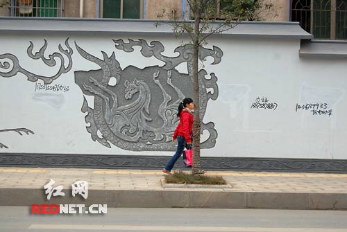 “文化墻什么時(shí)候成了‘辦證’廣告欄?”網(wǎng)友“嫦娥E號(hào)”拍下了這些出現(xiàn)在文化墻上的醒目電話號(hào),在紅網(wǎng)論壇長(zhǎng)沙版發(fā)帖(點(diǎn)擊進(jìn)入)時(shí)如此質(zhì)疑。