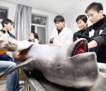 下午4時(shí)許,中國(guó)科學(xué)院水生所白鰭豚館內(nèi),工作人員正在進(jìn)行解剖。