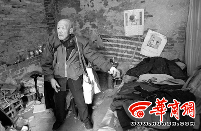 老人的家在后村里很深的一個(gè)角落,一間六七平方米的破舊磚房被荒草圍了個(gè)嚴(yán)實(shí),沒有窗戶,沒有燈,屋里非;璋怠R粡埓u頭壘起的床上堆了幾件破舊的棉襖和褥子,靠近房門處的一個(gè)小蜂窩煤爐就是老人做飯、取暖的依靠,地上胡亂扔著一些雜物。