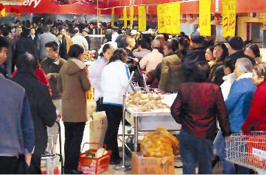 該超市人事部負責(zé)人李靜告訴記者,按照預(yù)定計劃,超市于22時在一樓大廳發(fā)放購買促銷面粉的小票,要求顧客持票購買。為了維持秩序,8名員工站成一排,彼此間距可容一人通過,老人們依次通過領(lǐng)取小票。