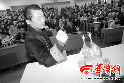 而最令大家感興趣的還是對(duì)一只母雞的催眠。這只剛剛從市場(chǎng)上買來的母雞一進(jìn)會(huì)場(chǎng),就拍著翅膀,想從徐毅強(qiáng)手中掙脫。不過,伴著徐毅強(qiáng)“別緊張、放松”的話語和輕柔的撫摸,慢慢的,這只母雞乖乖地躺在了桌面上,一動(dòng)不動(dòng),看上去很安靜。“其實(shí)催眠并不神秘,我們經(jīng)?梢钥吹剑诿餍茄莩獣(huì)上,粉絲會(huì)在偶像的帶動(dòng)和引導(dǎo)下,作出揮手或吶喊等反應(yīng),這時(shí)候可以說他們也被偶像催眠了!钡谒能娽t(yī)大學(xué)心理教研室副教授肖瑋用了非常通俗的一個(gè)比喻,解釋了人為什么會(huì)被催眠。