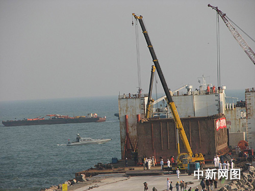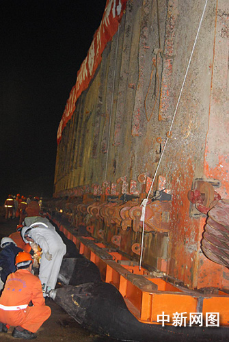 據(jù)介紹,今天適逢一個(gè)月內(nèi)潮位最高之日,本最有利于“南海一號(hào)”登陸。經(jīng)過今晚約兩個(gè)小時(shí)的努力,“南海一號(hào)”在甲板上被拖移了約十六米,但離碼頭尚有約八米。