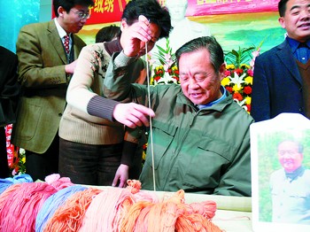本報(bào)韶山訊(記者 劉炬 林俊 陳飛)昨日下午,《偉大領(lǐng)袖毛澤東》絨繡像啟繡儀式在韶山毛澤東同志紀(jì)念館舉行。毛澤東堂侄毛岸平在絨繡工藝師的指導(dǎo)下為繡像啟繡第一針。這件精美的手工藝品,將在明年毛澤東誕辰115周年時(shí)完成,屆時(shí),它也將成為毛澤東文藝館落成后的首批展品。