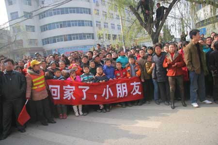 11時,一個由近20輛車組成的車隊從賓館出發(fā)到高速路口迎接孩子?吹杰囮牫鰜,人群讓出通道。擠在人群最前面的是淅川縣的部分小學生。他們舉著小旗、拍起巴掌,拉起條幅“小朋友,歡迎你們回家”。