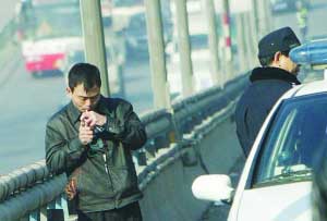 昨天上午,陽(yáng)光燦爛,一名男子徘徊在車來(lái)車往的新莊立交橋上。由于這座橋只允許機(jī)動(dòng)車通行,他很快引起了路過(guò)市民的注意。接下來(lái),這名男子做出了更讓人吃驚的舉動(dòng),只見(jiàn)他站到護(hù)欄邊,攀著鐵欄做欲跳橋狀。一市民急忙報(bào)警,此時(shí)是10點(diǎn)02分。